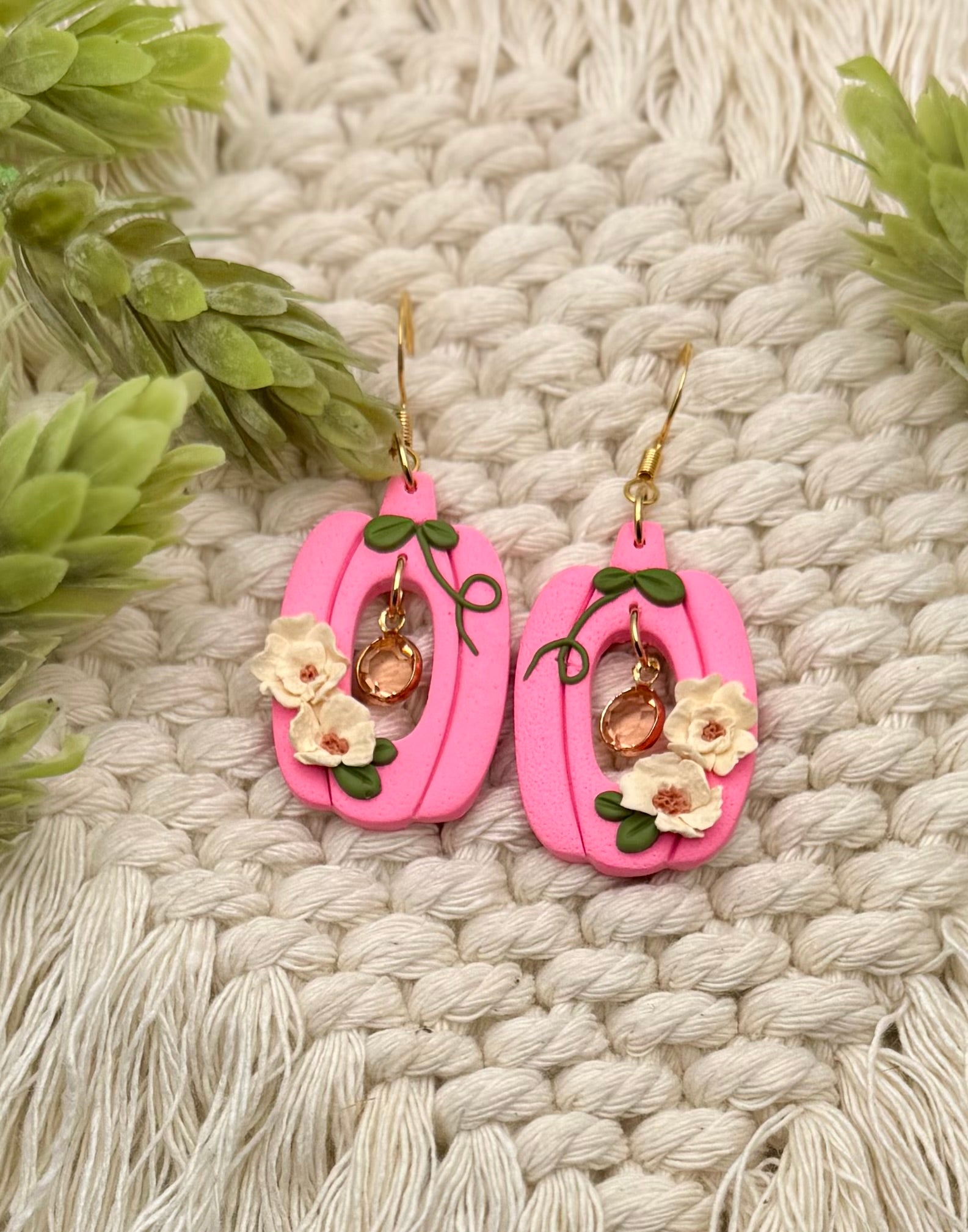 Soft, sweet, and full of fall magic — Pumpkin Kiss earrings blend sculpted ivory florals, swirling green vines, and a warm peach crystal, all tucked into a pink pumpkin frame. Finished with 18k gold earring hooks, these earrings are as elegant as they are playful.